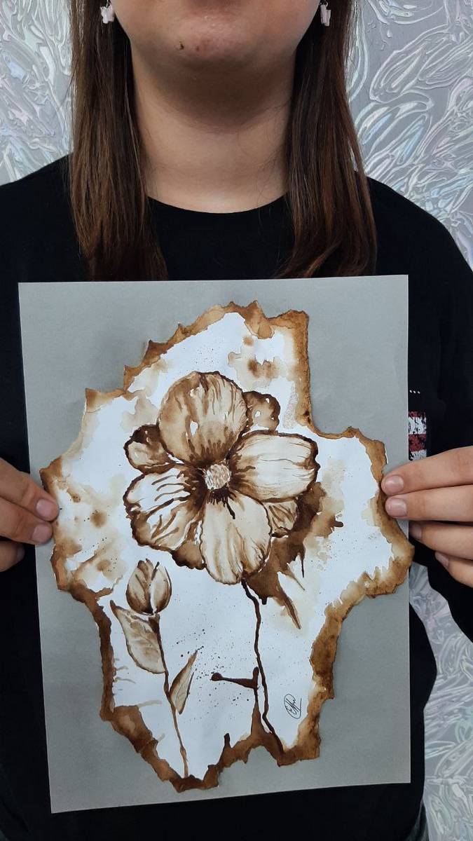 Выбрав темой урока «Весну», юные художницы под руководством наставника создают удивительные работы. Вместо привычной акварели или гуаши в ход идет натуральный кофе. Теплая гамма — от нежного бежевого до насыщенного темно-шоколадного — позволяет добиться удивительной глубины и мягкости. На бумаге «распускаются» изящные цветы, наполненные солнечным светом и уютом.