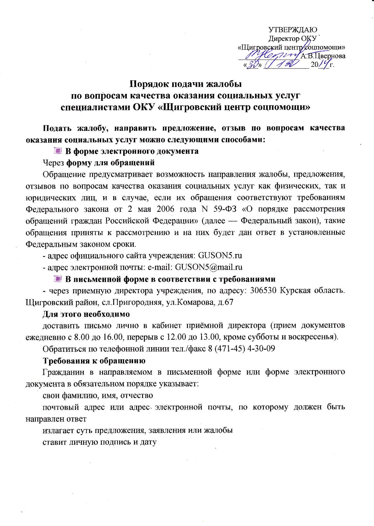 Порядок подачи жалобы по вопросам качества оказания социальных услуг специалистами ОКУ "Щигровский центр соцпомощи"