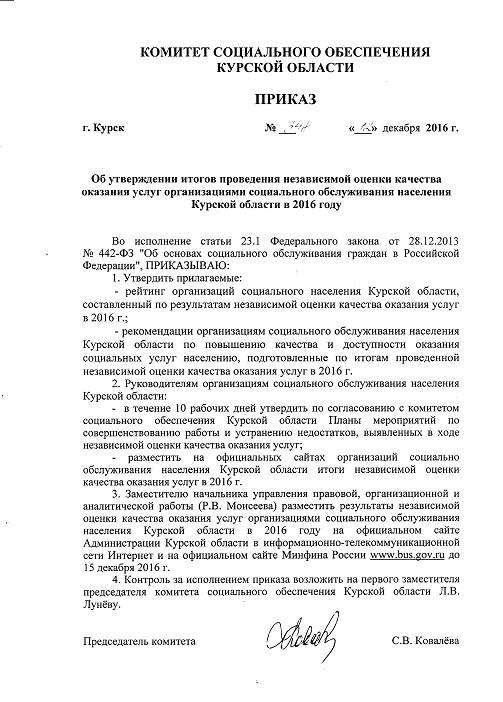 Приказ от 12.12.2016г. № 347 Об утверждении итогов проведения независимой оценки качества оказания услуг организациями социального обслуживания населения Курской области в 2016г.