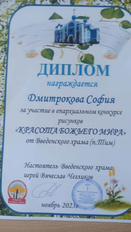 Воспитанница стационарного отделения -социальный приют для детей и подростков ОКУ «Щигровский центр социальной помощи семье и детям «Импульс» Дмитракова София приняла участие в епархиальном конкурсе рисунков «Красота Божьего мира» от Введенского храма (п.Тим).