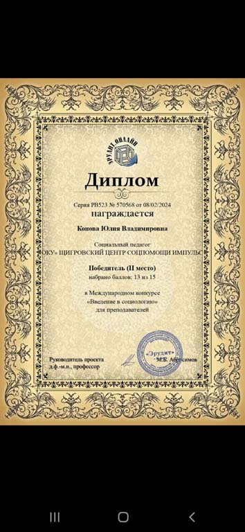 Социальный педагог стационарного отделения-социальный приют для детей и подростков ОКУ «Щигровский центр социальной помощи семье и детям «Импульс» Конова Юлия Владимировна заняла второе место в Международном конкурсе Эрудит.Онлайн «Введение в социологию для преподавателей».