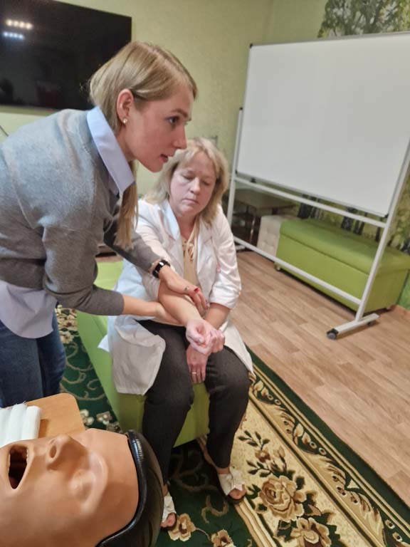 29 февраля врач анестезиолог-реаниматолог ОБУЗ «Курская областная станция скорой медицинской помощи» Выродова Анастасия Андреевна в  ходе  лекции  с  практическим занятием напомнила  сотрудникам  Центра, что оказывающий первую помощь должен знать основные признаки нарушения жизненно важных функций организма, уметь оценивать  состояние пострадавшего, определять последовательность применяемых приемов доврачебной  (первой) помощи, использовать подручные средства при оказании помощи.  Приемы оказания доврачебной (первой) помощи при следующих состояниях: переломах, ушибах, растяжениях обмороках, кровотечения, отравления, ожогах, гипертермии, асфиксии, укусах насекомых и животных, тепловых ударах, сердечно-легочной реанимации и других опасных состояниях были закреплены в ходе практического занятия.