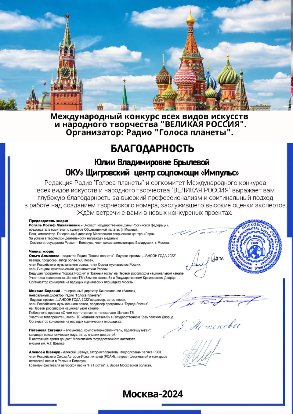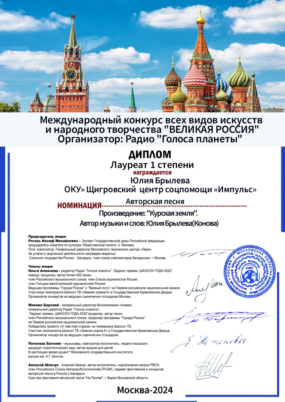 Поздравляем   социального педагога ОКУ «Щигровский центр социальной помощи семье и детям «Импульс» Конову Юлию Владимировну с  победой  в  международном конкурсе всех видов искусств и народного творчества «Великая Россия», ставшей  лауреатом  1 степени в номинации: авторская песня, произведение: «Курская земля».