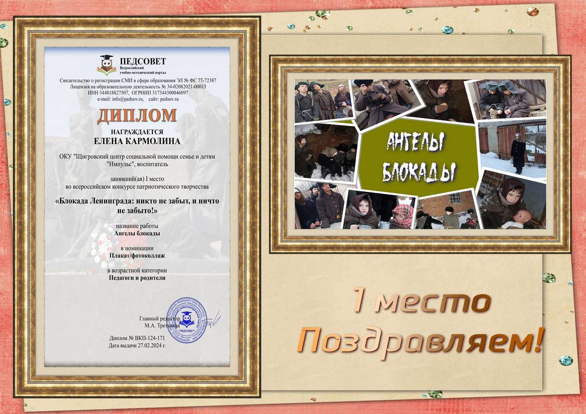 Поздравляем воспитателя ОКУ «Щигровский центр социальной помощи семье и детям «Импульс» Кармолину Елену Михайловну с победой во всероссийском конкурсе патриотического творчества «Блокада Ленинграда: никто не забыт, и ничто не забыто!», занявшей 1 место в номинации: «Плакат/фотоколлаж».