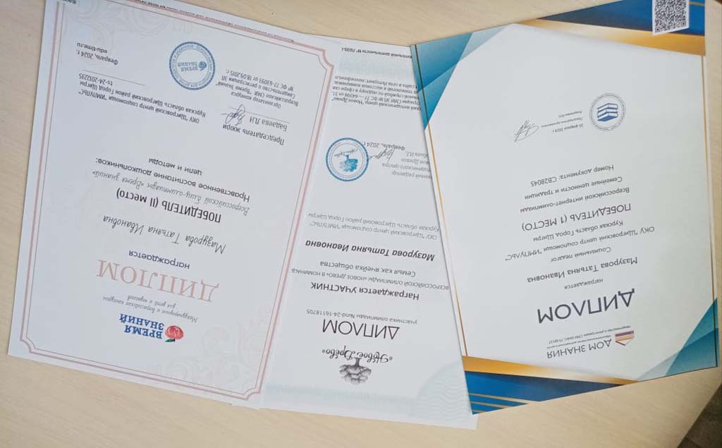 Социальный  педагог ОКУ «Щигровский центр социальной помощи семье и детям «Импульс» Мазурова Татьяна Ивановна победила в олимпиадах: всероссийского методического центра «Новое  дерево» в номинации «Семья как ячейка общества»; всероссийского СМИ  «Время  знаний» в  номинации «Нравственное воспитание дошкольников: цели и методы»; образовательного портала  «Дом знаний» в номинации «Семейные  ценности и  традиции».
