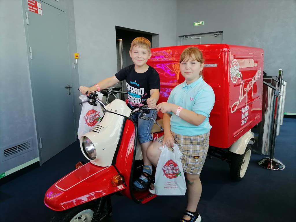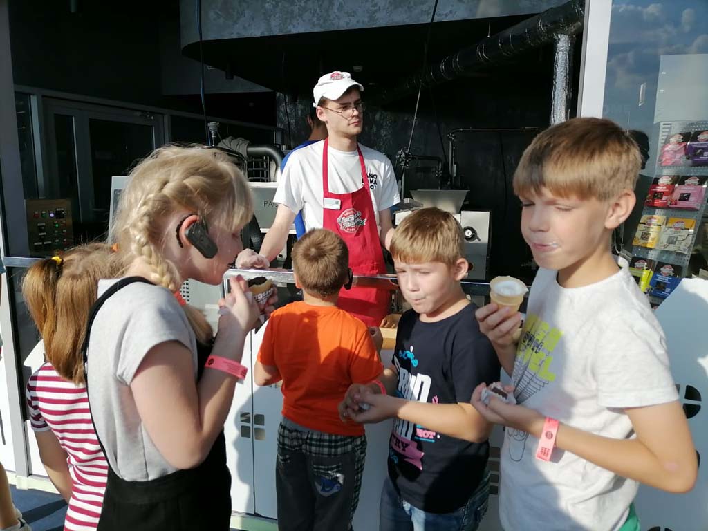 Девчонки и мальчишки в завершении экскурсии смогли попробовать мороженное только что снятое с конвейера.
