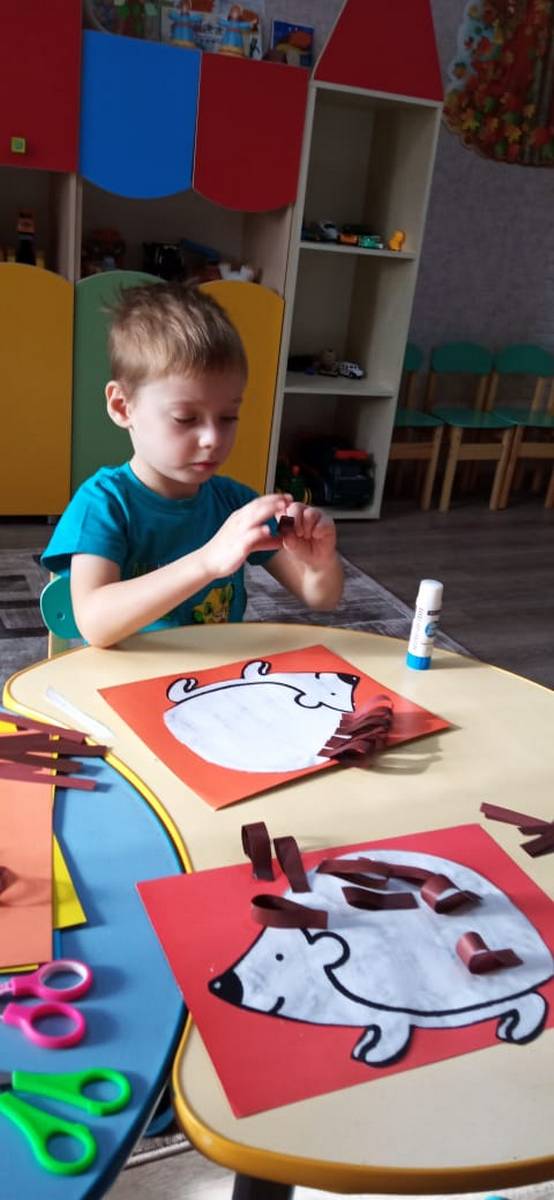 В стационарном отделении-социальный приют для детей и подростков» ОКУ «Щигровский центр социальной помощи семье и детям «Импульс» воспитанниками младшей группы работали с цветной бумагой над объемной аппликация «Ежик из бумажных полос». Занятие способствовало не только развитию у детей навыков работы с цветной бумагой,  мелкой моторики, творческих способностей и воображения, но и созданию позитивной атмосферы для творчества и самовыражения.