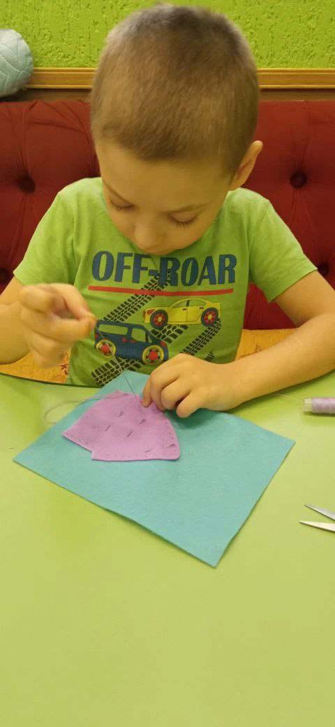В отделении «Дошкольник» Щигровского центра «Импульс» наши маленькие воспитанники работали над аппликацией из фетра.  В ходе занятия дети освоили «прямой стежок». Работа с иголкой — это настоящий вызов для дошкольника, требующий предельной концентрации и аккуратности.