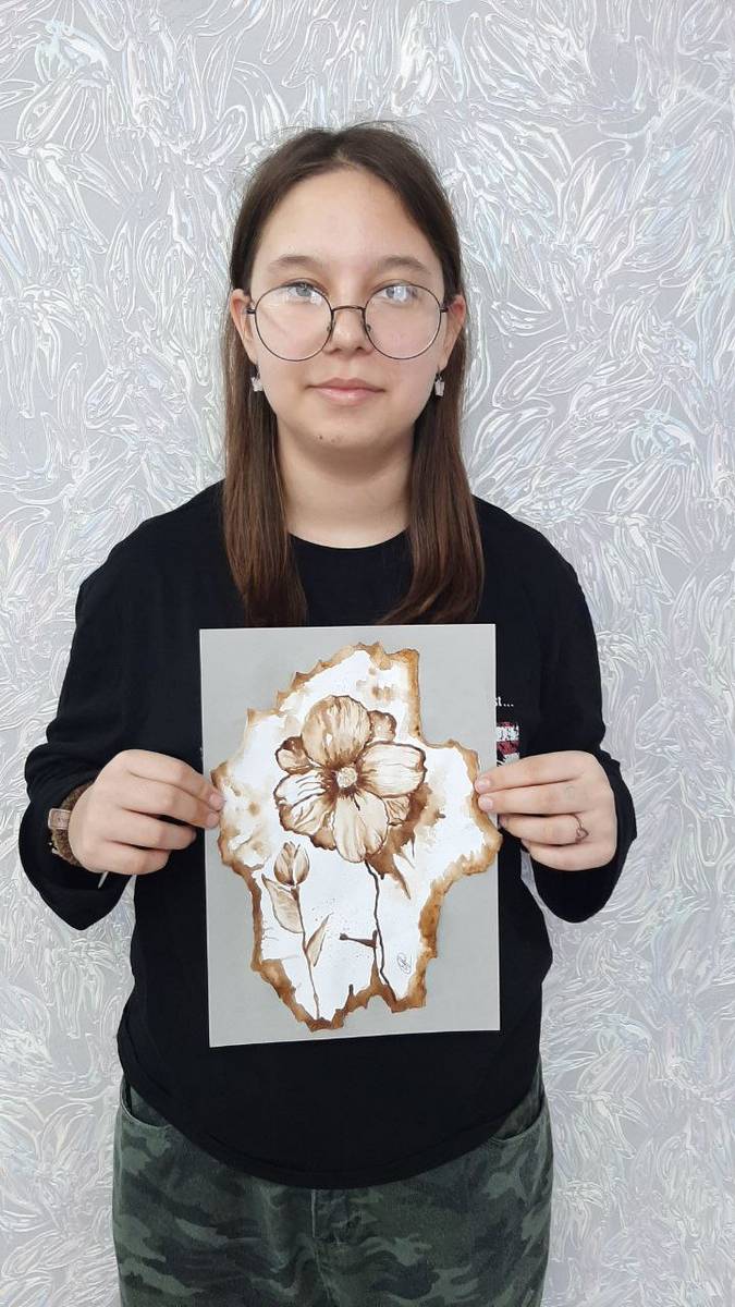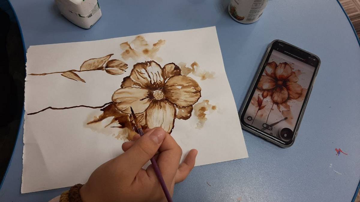 Выбрав темой урока «Весну», юные художницы под руководством наставника создают удивительные работы. Вместо привычной акварели или гуаши в ход идет натуральный кофе. Теплая гамма — от нежного бежевого до насыщенного темно-шоколадного — позволяет добиться удивительной глубины и мягкости. На бумаге «распускаются» изящные цветы, наполненные солнечным светом и уютом.