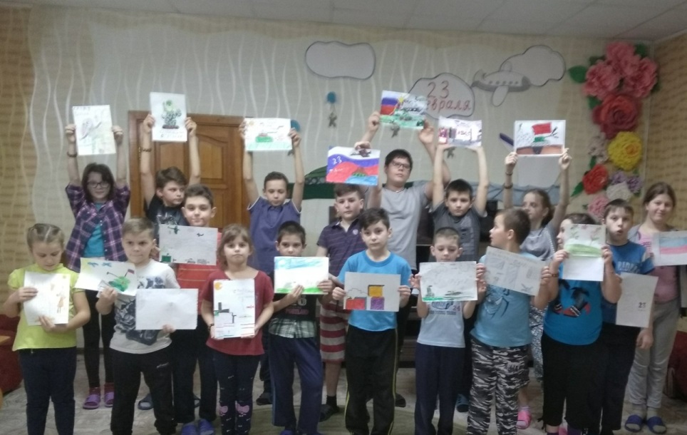 В замечательный праздник - День защитников Отечества воспитанники с огромным интересом и восторгом подготовили выставку рисунков «Военный вернисаж».  Все очень старались и переживали, что же получиться у них. Работы получились разные, красивые.   Мастерству наших умельцев можно позавидовать! И, конечно же, никто не остался без подарков. Сладости и фрукты стали вкусным праздничным угощением для всех воспитанников.