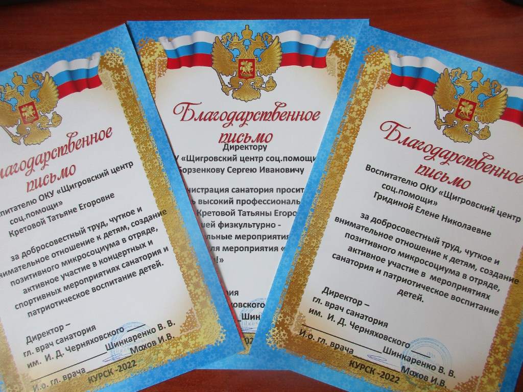 За добросовестный труд, чуткое и внимательное отношение к детям, создание позитивного микросоциума в среде, активное участие в мероприятиях санатория и патриотическое воспитание детей Благодарственными письмами администрации санатория была высоко оценена работа наших воспитателей, которые сопровождали детей на отдыхе: Гридиной Елены Николаевны и Кретовой Татьяны Егоровны.