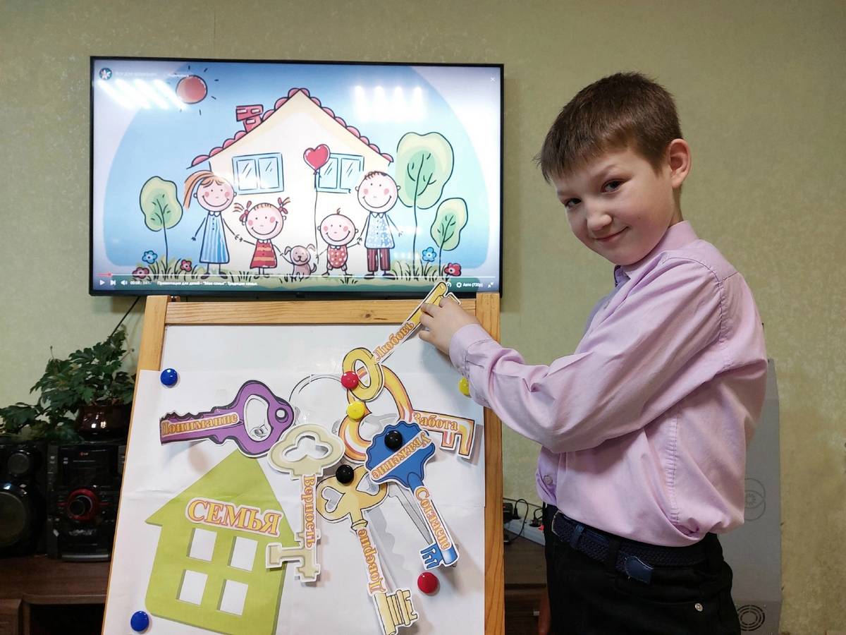Занятие началось с  просмотра  видеоролика «Моя семья», что позволило создать доброжелательную  атмосферу  и настроить детей  на  рабочий лад. В ходе занятия использовались разнообразные формы работы: арт-терапевтический метод коллажирования «Дом счастливой семьи», психологическая игра «Подбери ключ к семейному  счастью», занимательные загадки и  пословицы о  семье. Ребята активно отвечали на  вопросы, рассуждали о  семейных традициях и  ценностях, составили правила  взаимоотношений в   семье. Все  это позволило сделать  занятие насыщенным и  разнообразным, что помогало удерживать познавательный  интерес и  выполнить поставленные цели и задачи.