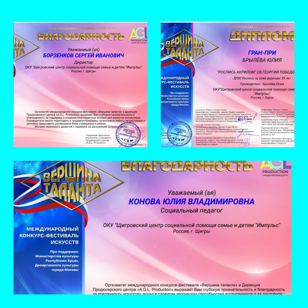 Социальный педагог Конова Юлия Владимировна, творческий псевдоним Брылева, награждена дипломом гран-при международного конкурса-фестиваля искусств «Вершина таланта» в номинации «Роспись акрилом». Директору Центра Борзенкову С.И. и   Коновой Юлии Владимировне объявлена благодарность за преданность искусству, вклад в развитие творческих способностей воспитанников и достойное представление своего региона.