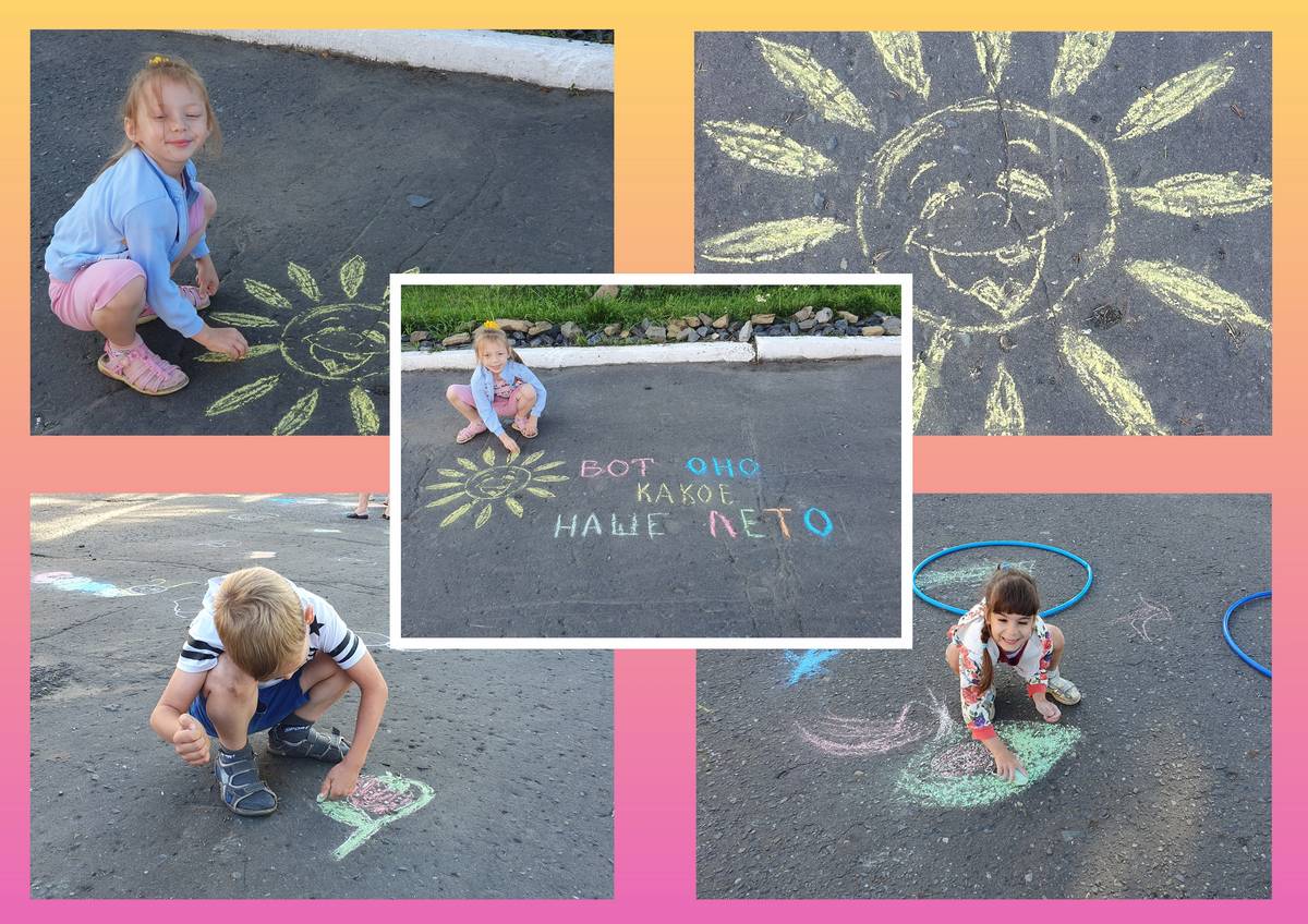 Дети делились впечатлениями о летнем отдыхе, отгадывали загадки и рисовали    это прекрасное время года. Асфальт расцвел яркими красками- желтое солнце, голубое небо, зеленая трава, разноцветные шары, бабочки и яркие цветы. Юные художники превратили серую асфальтированную площадку в летнюю яркую поляну. Итогом мероприятия было хорошее настроение, улыбки и искренняя детская радость.