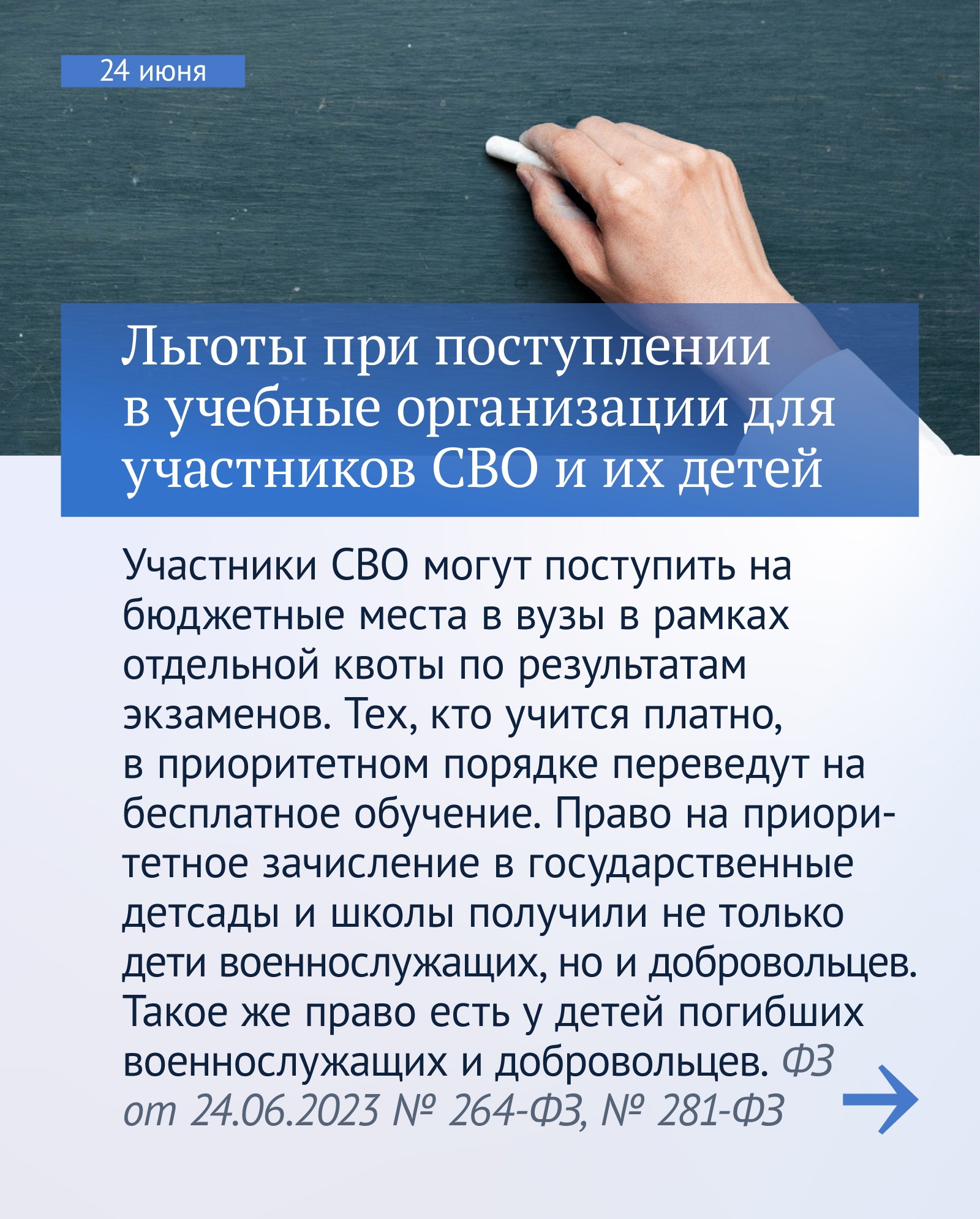 «Начали работать законы с дополнительными мерами поддержки участников специальной военной операции и их детей. Им полагаются льготы при зачислении в детские сады и школы, при поступлении в вузы.